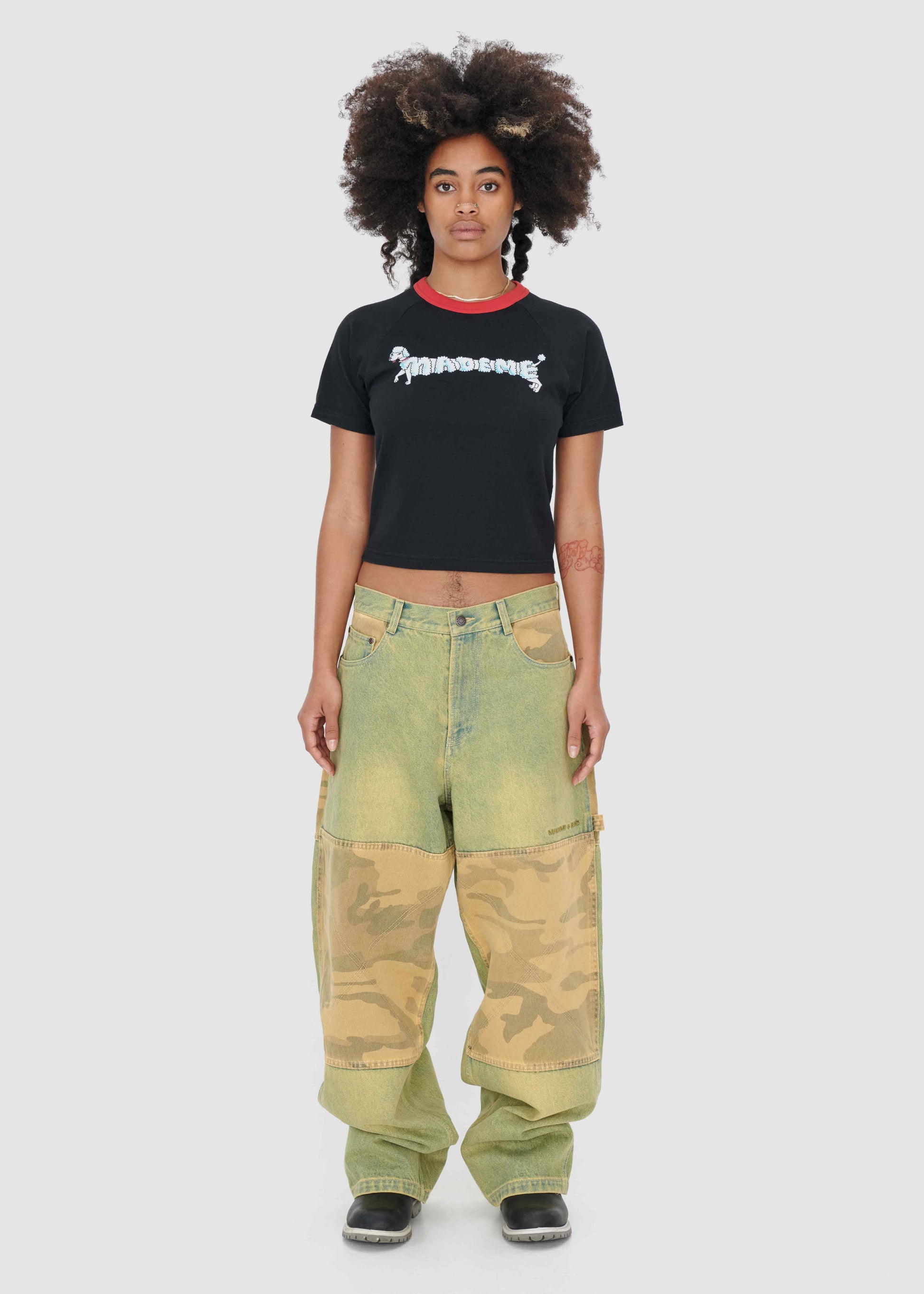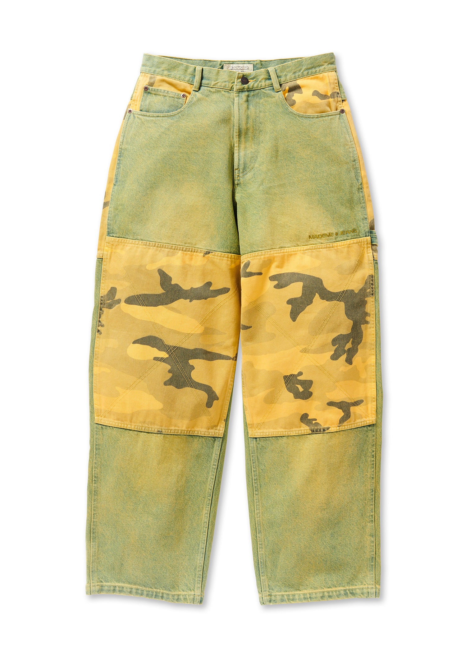 Non-stretch, 13 oz. denim, with yellow over-dye. Oversized fit, patch pockets and zipper fly closure. MadeMe paper patch at back and MadeMe branded shanks. MadeMe Jeans embroidery on wearers left leg.
