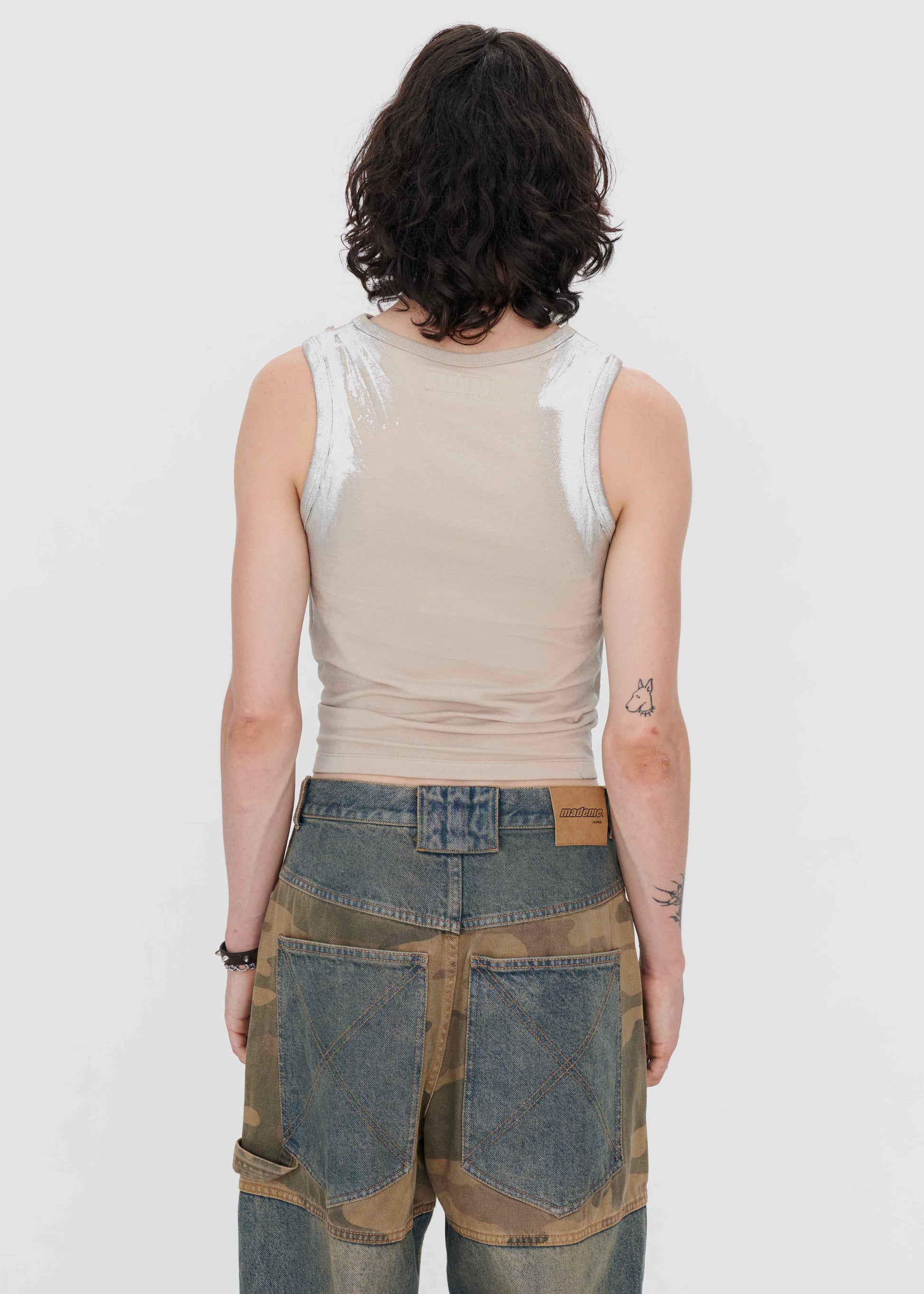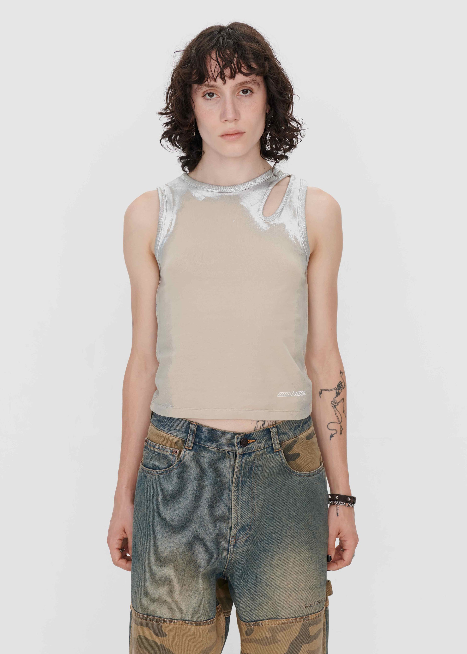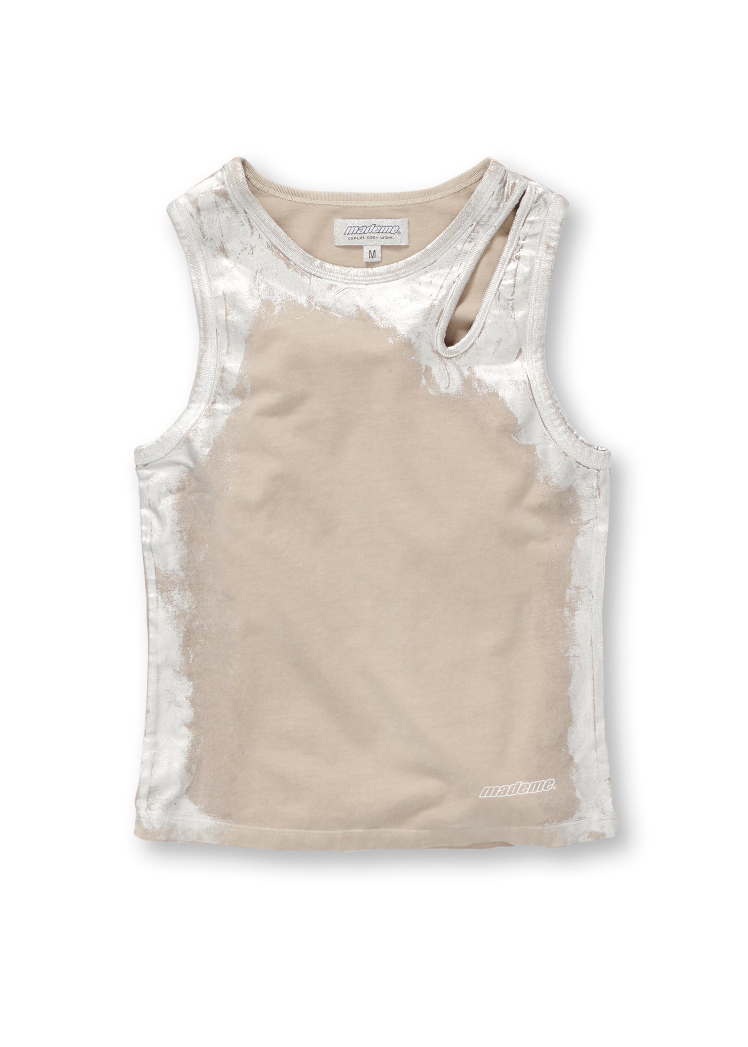 Foil overprint technique. Tight fit, MadeMe logo screen print at wearers left hem.